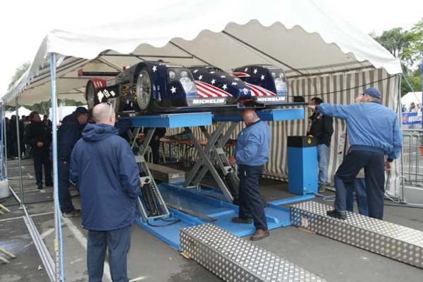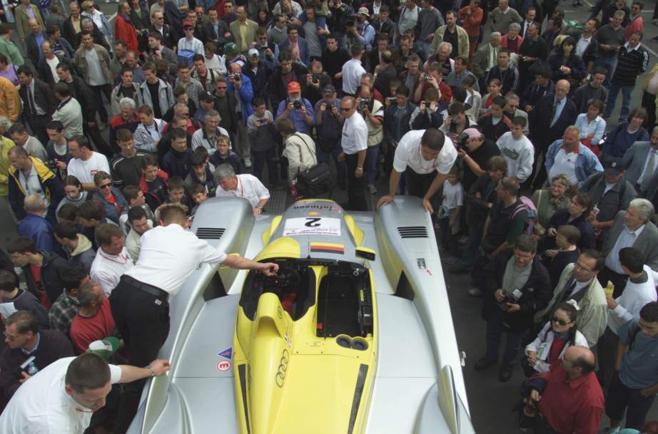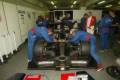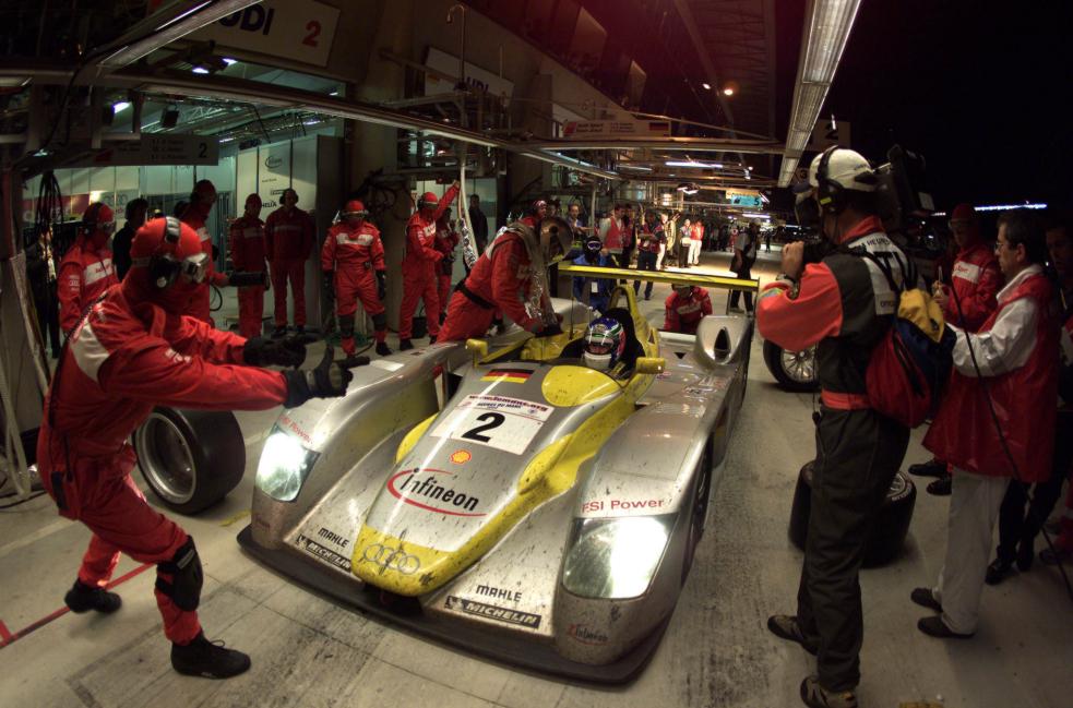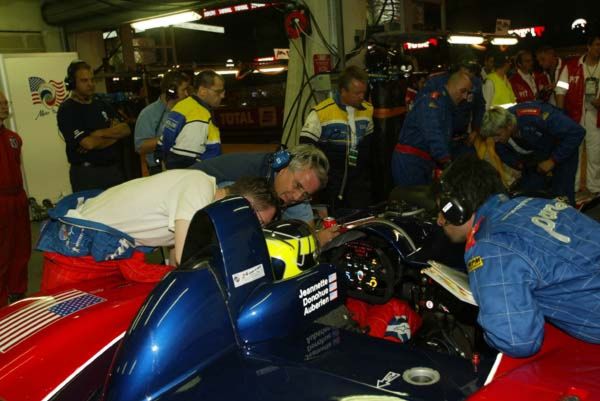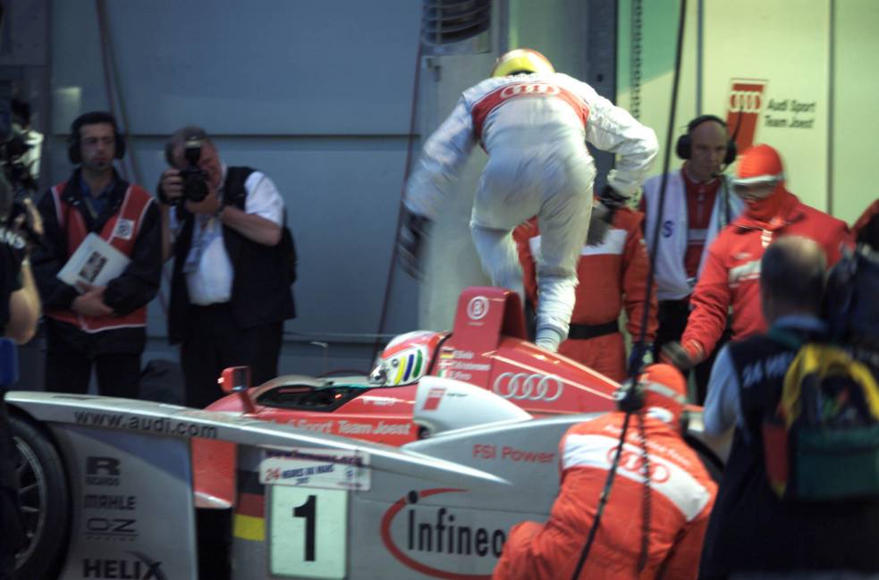 Within the pits - Frank Biela hands over to Tom Kristensen.
