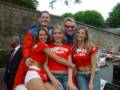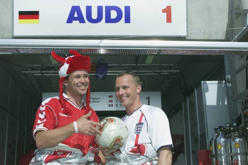 Football at the racetrack. Denmark vs England. Tom Kristensen vs Johnny Herbert.